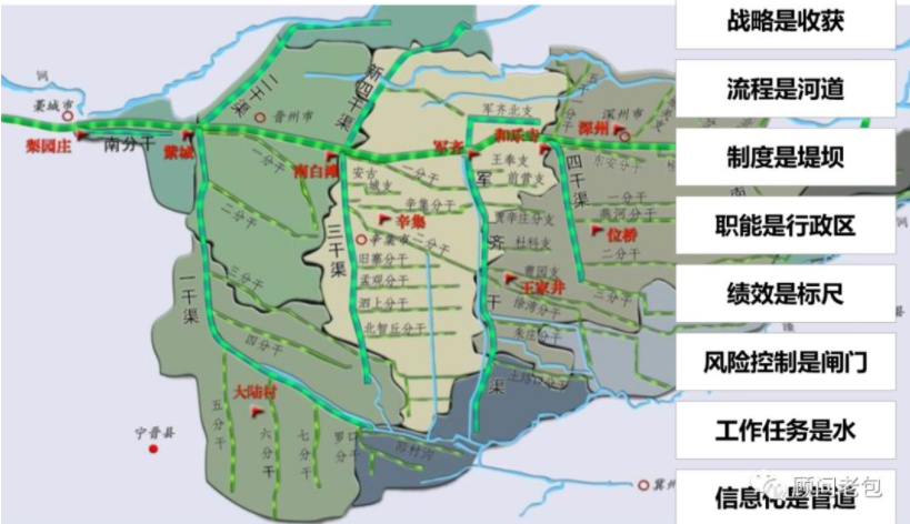 我们将这片土地设想成一个企业,河道是企业的流程。在这个基础上我们来思考流程和几个管理概念的关系,包括战略、职能、制度、绩效、工作任务、风险内控、信息化。