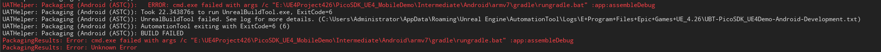 1 UATHelper: Packaging (Android (ASTC)): ERROR: cmd.exe failed with args /c "E:\UE4Project426\PicoSDK_UE4_MobileDemo\Intermediate\Android\armv7\gradle\rungradle.bat" :app:assembleDebug 2 PackagingResults: Error: cmd.exe failed with args /c "E:\UE4Project426\PicoSDK_UE4_MobileDemo\Intermediate\Android\armv7\gradle\rungradle.bat" :app:assembleDebug 3 PackagingResults: Error: Unknown Error
