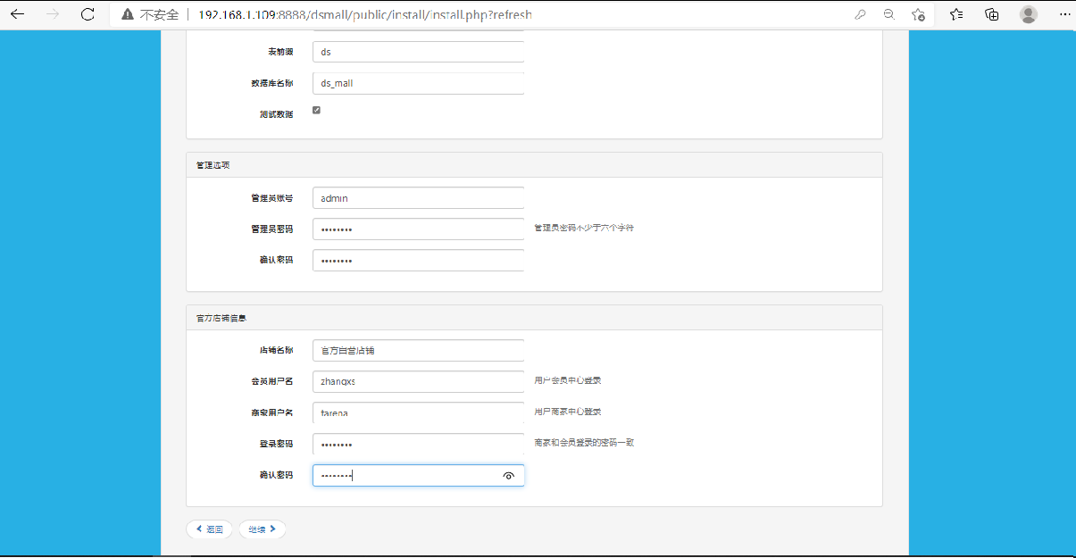 在安装页面输入管理选项和用户信息
