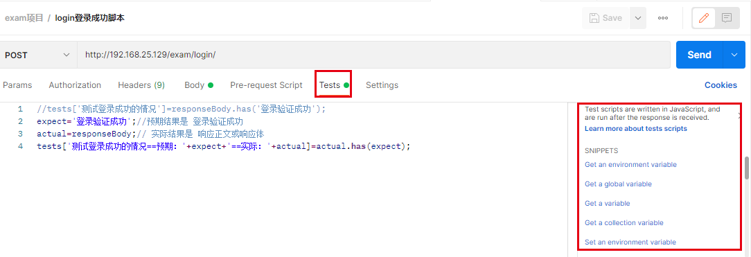 用于处理响应结果(响应头、响应体/响应正文)、进行断言(判断接口的返回结果是否符合预期)