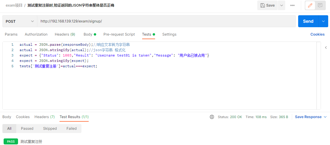 测试用户重复注册时,验证返回的JSON字符串整体是否正确