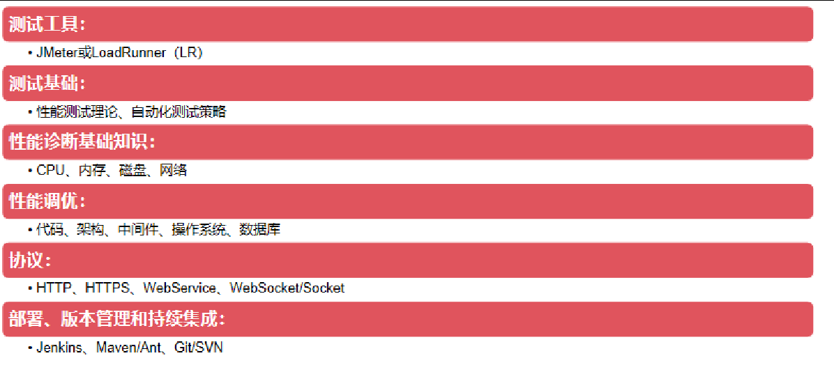 性能测试类型包括负载测试、压力测试、强度测试、容量测试、并发测试、稳定性测试(可靠性测试、疲劳强度测试)、配置测试、失败测试等