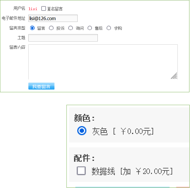 如果”留言"单选按钮默认被选中,点击”售后"单选按钮