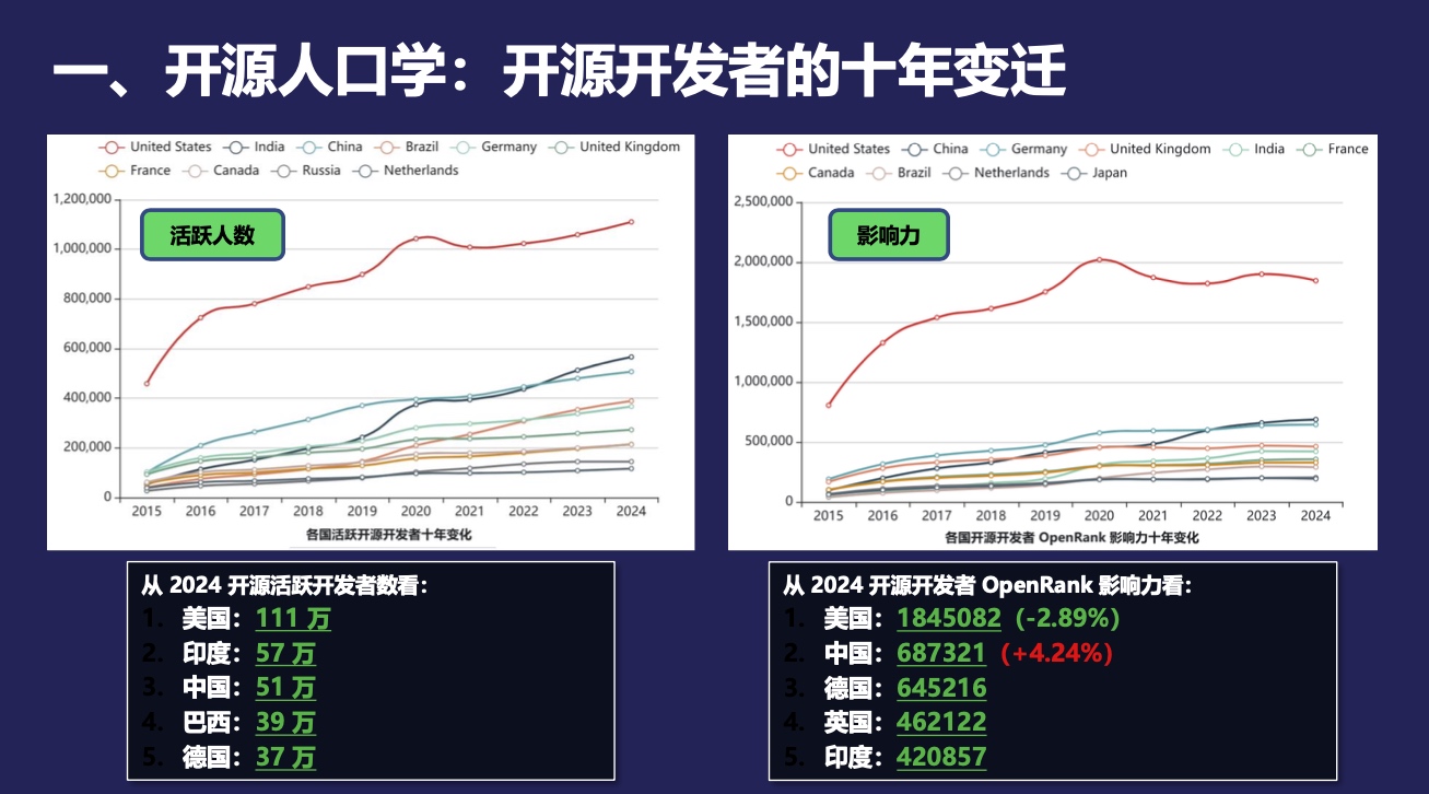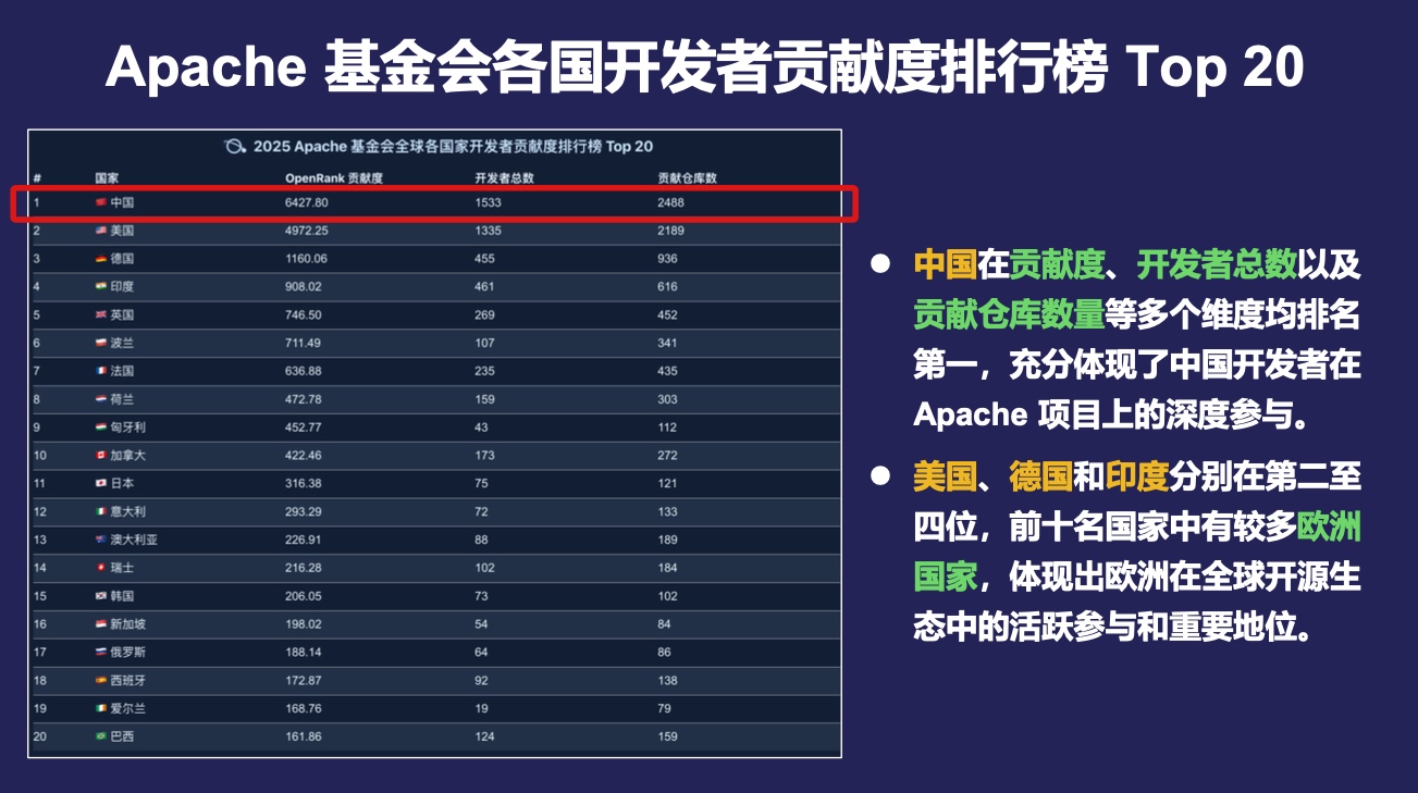 2023 年,中国开发者对 Apache 基金会的贡献度首次超过美国,2024 年则把优势扩大到“比美国少一半的人,却交出了近一半的贡献”。
