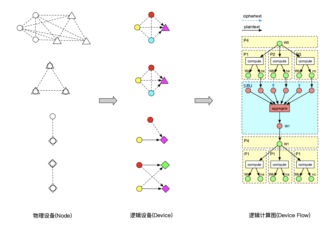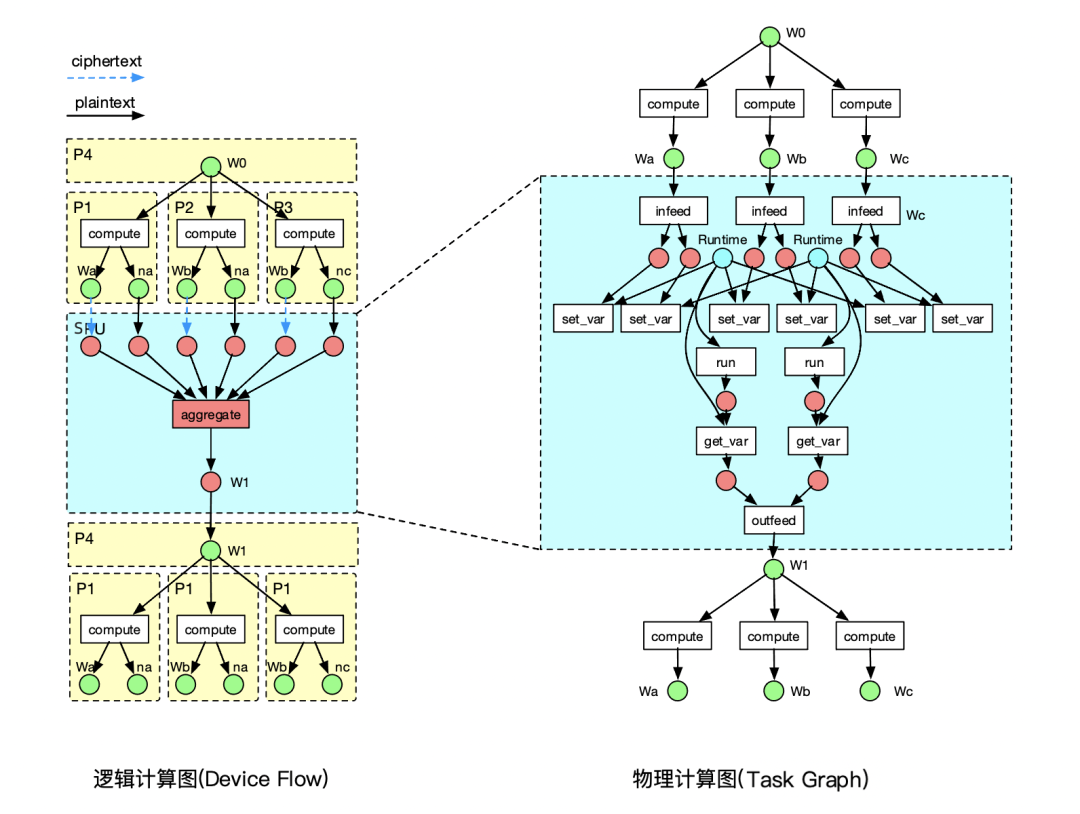 - 明密文混合调度层:提供了统一的设备调度抽象,将上层算法描述为一张有向无环图,其中节点表示某个设备上的计算,边表示设备之间的数据流动,即逻辑计算图。逻辑计算图由分布式框架进一步拆分并调度至物理节点。
