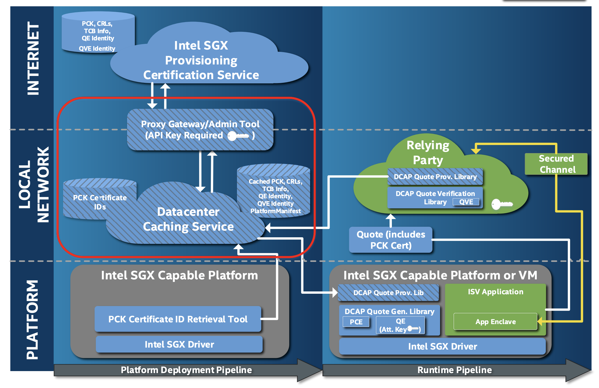 ECDSA配合 Intel SGX DCAP(Intel Software Guard Extensions Data Center Attestation Primitives)可以允许用户构建自己的认证服务,而不需要依赖intel的远程认证服务。intel提供了Provisioning Certification Caching Service (PCCS)来帮助用户完成这一目标。