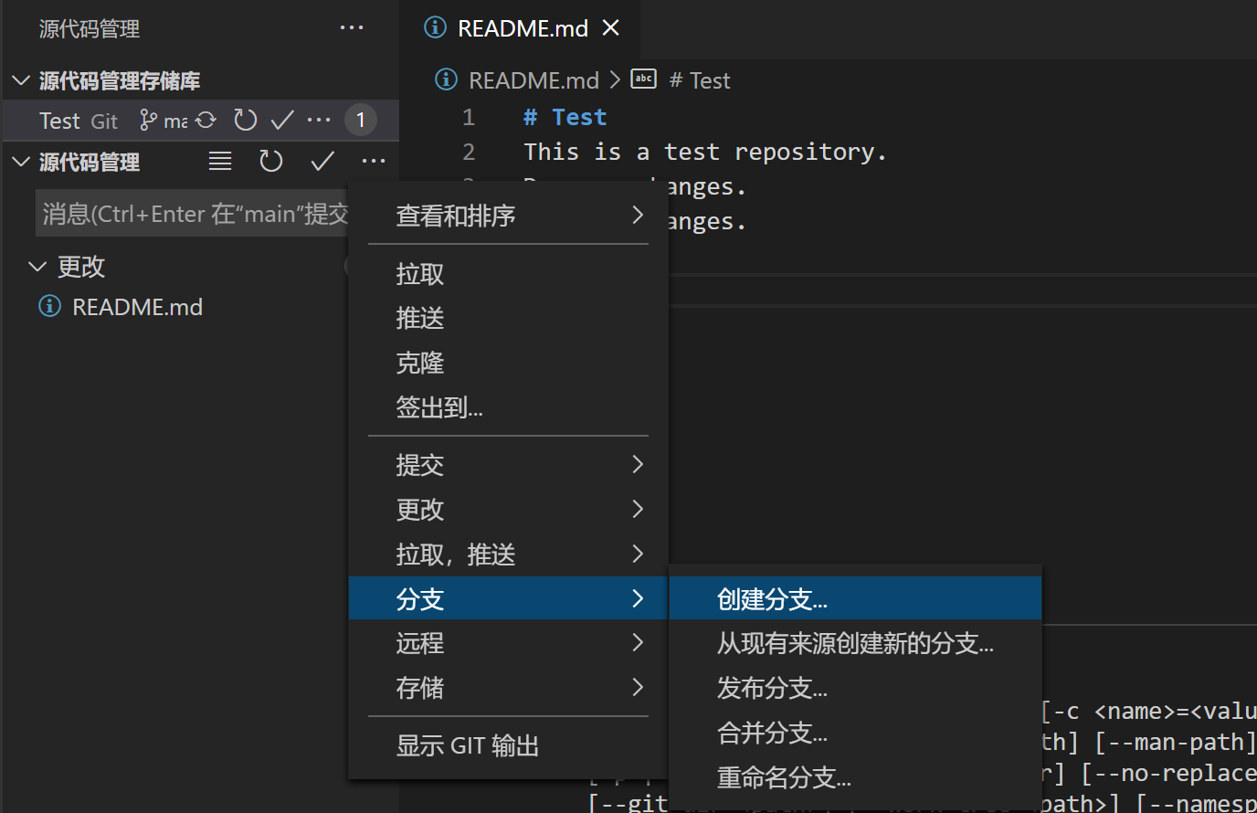 在VS Code中创建分支一个新的分支,可使用图形化界面或者指令git checkout -b mybranch进行创建。