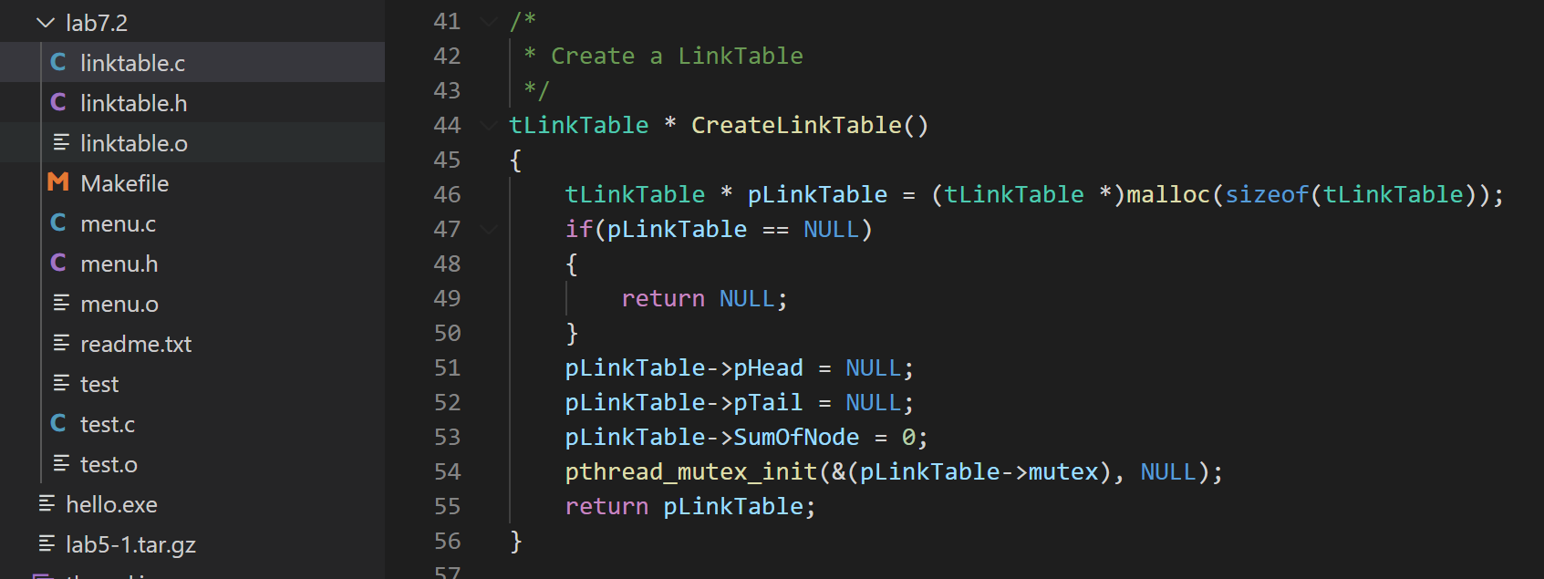 可以看到,在linktable.c文件中通过定义pthread_mutex_t mutex来提供临界区的互斥功能,为后续的项目安全做好准备。