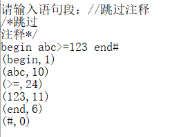 1 #include<stdio.h> 2 #include<string.h> 3 #include<stdlib.h> 4 char prog[80],word[8],ch; 5 char *tag[6]={"begin","if","then","while","do","end"}; 6 int syn,i,j,p,sum,row,y; 7 8 void getsyn(){ 9 for(i=0;i<8;i++) 10 word[i]=NULL; 11 ch=prog[p++]; 12 while(ch==' '){ 13 ch=prog[p]; 14 p++; 15 } 16 //标识符 17 if((ch>='a'&&ch<='z')||(ch>='A'&&ch<='Z')){ 18 j=0; 19 while((ch>='0'&&ch<='9')||(ch>='a'&&ch<='z')||(ch>='A'&&ch<='Z')){ 20 word[j++]=ch; 21 ch=prog[p++]; 22 } 23 word[j++]='\0'; 24 p--; 25 syn=10; 26 for(i=0;i<6;i++){ 27 if(strcmp(tag[i],word)==0){ 28 syn=i+1; 29 break; 30 } 31 } 32 } 33 //数字 34 else if(ch>='0'&&ch<='9'){ 35 sum=0; 36 while(ch>='0'&&ch<='9'){ 37 sum=sum*10+(ch-'0'); 38 ch=prog[p++]; 39 } 40 p--; 41 syn=11; 42 } 43 //符号 44 else switch(ch){ 45 case ':':i=0;word[i++]=ch; 46 ch=prog[p++]; 47 if(ch=='='){ 48 word[i++]=ch; 49 syn=18; 50 }else{ 51 syn=17; 52 p--; 53 } 54 break; 55 case '<': 56 i=0; 57 word[i++]=ch; 58 ch=prog[p++]; 59 if(ch=='='){ 60 word[i++]=ch; 61 syn=21; 62 }else if(ch=='>'){ 63 word[i++]=ch; 64 syn=22; 65 }else{ 66 syn=20; 67 p--; 68 } 69 break; 70 case '>': 71 i=0; 72 word[i++]=ch; 73 ch=prog[p++]; 74 if(ch=='='){ 75 word[i++]=ch; 76 syn=24; 77 }else{ 78 syn=23; 79 p--; 80 } 81 break; 82 case '+':word[0]=ch;syn=13;break; 83 case '-':word[0]=ch;syn=14;break; 84 case '*':word[0]=ch;syn=15;break; 85 //case '/':word[0]=ch;syn=16;break; 86 case '=':word[0]=ch;syn=25;break; 87 case ';':word[0]=ch;syn=26;break; 88 case '(':word[0]=ch;syn=27;break; 89 case ')':word[0]=ch;syn=28;break; 90 case '#':word[0]=ch;syn=0;break; 91 case '\n':syn=233;break; 92 //注释 93 case '/': 94 i=0; 95 word[i++]=ch; 96 ch=prog[p++]; 97 if(ch=='/'){ 98 do{ 99 p++; 100 }while(prog[p]!='\n'); 101 if(prog[p]=='\n'){ 102 syn=233;break; 103 } 104 } 105 106 if(ch=='*'){ 107 do{ 108 p++; 109 if(p==y-1 ){ 110 syn=-1;break; 111 } 112 }while(prog[p]=='*'&&prog[p+1]!='/'||prog[p]!='*'&&prog[p+1]=='/'||prog[p]!='*'&&prog[p+1]!='/'); 113 if(prog[p]=='*'&&prog[p+1]=='/'){ 114 p++;p++; 115 syn=233; 116 break; 117 } 118 } 119 120 else{ 121 p--;ch=word[i];syn=16;break; 122 } 123 break; 124 125 default:syn=-1;break; 126 } 127 } 128 129 int main(){ 130 p=0; 131 row=1; 132 printf("请输入语句段:"); 133 do{ 134 ch=getchar(); 135 prog[p++]=ch; 136 }while(ch!='#'); 137 y=p; 138 p=0; 139 do{ 140 getsyn(); 141 switch(syn){ 142 case -1:printf("在第%d行有错误!\n",row);break; 143 case 233:row+=1;break; 144 case 11:printf("(%d,%d)\n",sum,syn);break; 145 default:printf("(%s,%d)\n",word,syn);break; 146 } 147 }while(syn!=0); 148 }