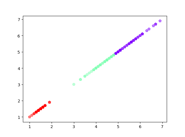 plt.scatter(x,x,c=y,s=50,cmap='rainbow',marker='p',alpha=0.5)