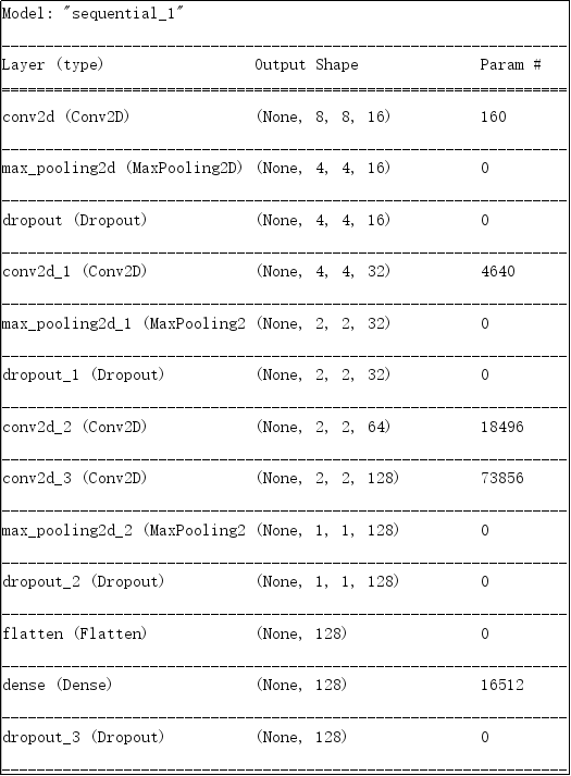 from tensorflow.keras.models import Sequential from tensorflow.keras.layers import Dense,Dropout,Flatten,Conv2D,MaxPool2D #建立模型 model = Sequential() ks = (3, 3) # 卷积核的大小 input_shape = X_train.shape[1:] # 一层卷积,padding='same',tensorflow会对输入自动补0 model.add(Conv2D(filters=16, kernel_size=ks, padding='same', input_shape=input_shape, activation='relu'))#第一层输入数据的shape要指定外,其他层的数据的shape框架会自动推导 # 池化层1 model.add(MaxPool2D(pool_size=(2, 2))) # 防止过拟合,随机丢掉连接 model.add(Dropout(0.25)) # 二层卷积 model.add(Conv2D(filters=32, kernel_size=ks, padding='same', activation='relu')) # 池化层2 model.add(MaxPool2D(pool_size=(2, 2))) model.add(Dropout(0.25)) # 三层卷积 model.add(Conv2D(filters=64, kernel_size=ks, padding='same', activation='relu')) # 四层卷积 model.add(Conv2D(filters=128, kernel_size=ks, padding='same', activation='relu')) # 池化层3 model.add(MaxPool2D(pool_size=(2, 2))) model.add(Dropout(0.25)) # 平坦层 model.add(Flatten()) # 全连接层 model.add(Dense(128, activation='relu')) model.add(Dropout(0.25)) # 激活函数softmax model.add(Dense(10, activation='softmax')) model.summary() model.compile(loss='categorical_crossentropy', optimizer='adam', metrics=['accuracy']) train_history = model.fit(x=X_train, y=Y_train, validation_split=0.2, batch_size=300, epochs=10, verbose=2) score = model.evaluate(X_test,Y_test) score