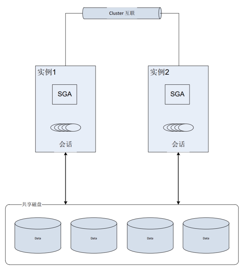 RAC (Real Application Cluster,真正应用集群) 数据库是一个共享磁盘的集群数据库。 RAC 数据库的每一个成员都有一个独立的 Oracle 实例,都拥有其独有的共享内存、进程与会话。 所有实例之间共享一组共同的数据文件,这些数据文件通过一个集群文件系统对所有实例都可见。假如数据库由两个节点,通过 Cluster 互联构成,如下图所示: