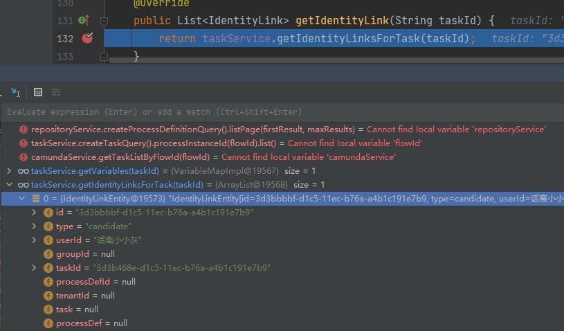 /** * 获取审批人 * @param taskId 任务Id * @return 审批人列表 */ @Override public List<IdentityLink> getIdentityLink(String taskId) { return taskService.getIdentityLinksForTask(taskId); }