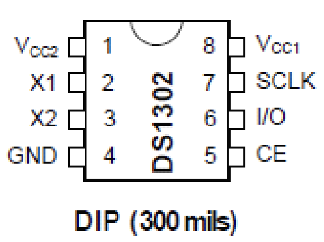 Vcc1:主电源;Vcc2:备份电源。当Vcc2>Vcc1+0.2V Vcc2>Vcc1+0.2V Vcc2>Vcc1+0.2V Vcc2>Vcc1+0.2V时,由Vcc2 向DS1302供电,当Vcc2< Vcc1时,由Vcc1向DS1302供电。