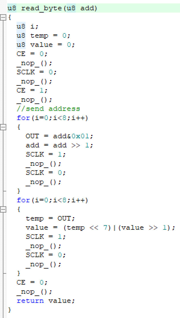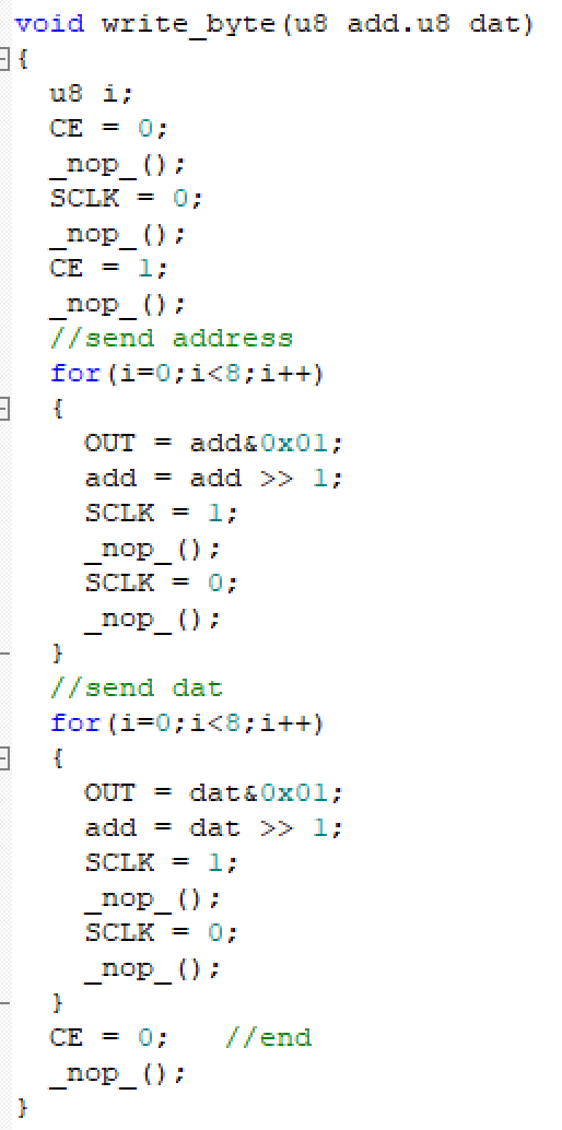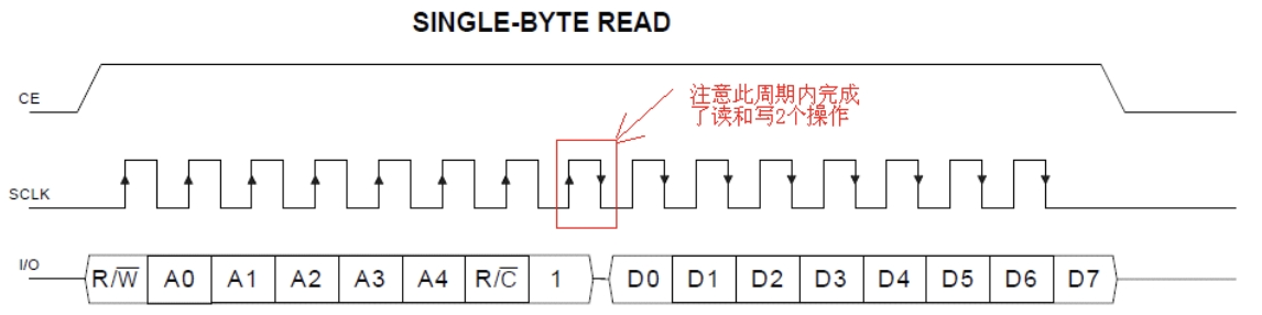 注:当写入控制字最后一位的上升沿结束后便会立即在接下来的下降沿写入数据,故在写入数据的循环中便先读出最低位,再设置下一次读写的下降沿。