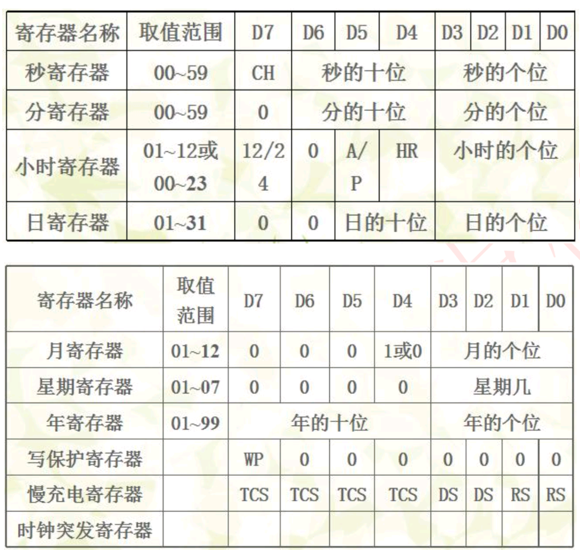 DS1302共有十二个寄存器,其中共有7个与日历、时钟相关,其存放的数据为BCD码形式。