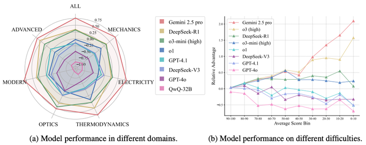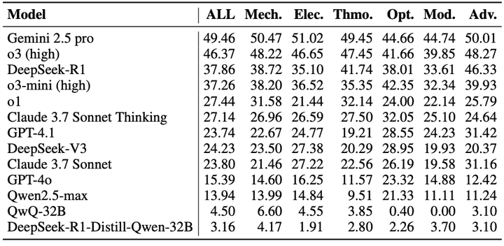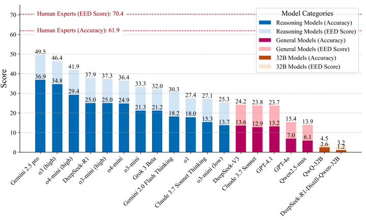 在 PHYBench 上的基准测试结果显示,即使是最先进的推理模型 Gemini 2.5 Pro,其准确率也仅为 36.9%,远低于人类专家的 61.9%。