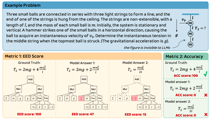 展示了一个来自PHYBench的示例问题,用于评估模型性能。图中使用了两个主要指标:表达式编辑距离(EED)得分和准确性。