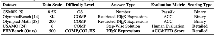 PHYBench 是一个包含 500 道物理问题的高质量基准,用于评估大型语言模型在物理场景下的复杂推理能力。