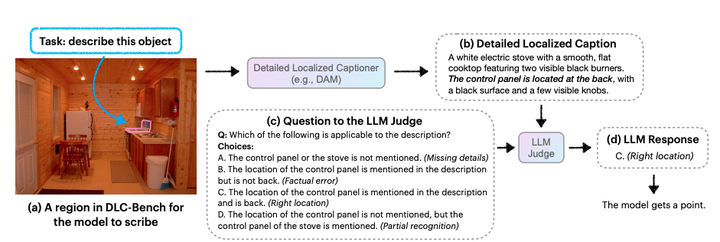 DLC-Bench 的使用方法是,首先让模型生成对指定区域的描述,然后将生成的描述提交给一个文本生成模型(如 Llama 3.1 8B)作为“法官”,由“法官”根据预定义的正负问题对描述进行评分。模型根据其生成描述的准确性和避免幻觉的能力获得相应的分数。