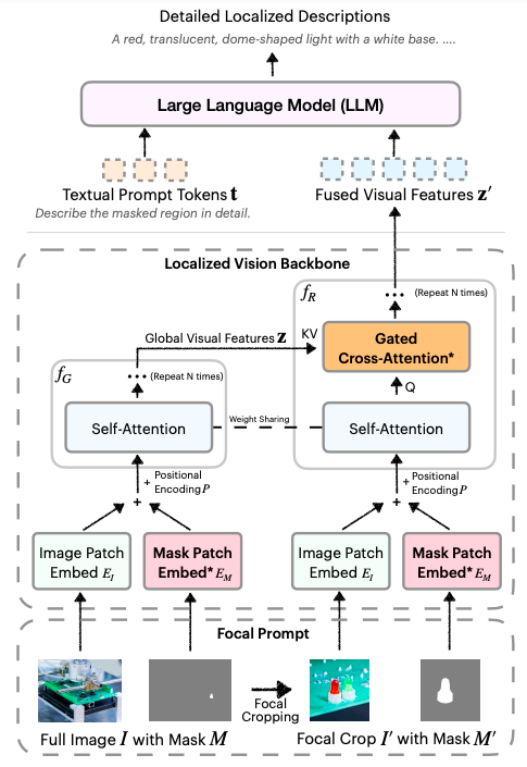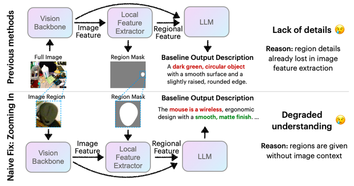 上图:以往的区域描述生成器从全局图像表示中提取区域特征,导致描述不够具体。下图:放大(裁剪图像区域)可以增强细节,但会丢失上下文线索,从而降低识别效果。这突显了需要一种设计,既能编码细节丰富的区域特征,又能保留上下文,以提升详细局部描述(DLC)的性能。