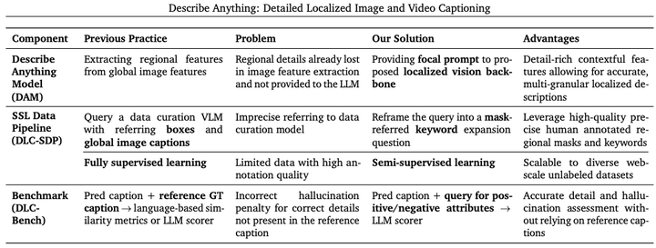 2025-04-23 , 由 NVIDIA、UC Berkeley 和 UCSF 等机构的研究人员创建了 Describe Anything Model(DAM)以及相关数据集和基准测试。DAM 通过关键创新(如焦点提示和局部视觉主干)解决了详细局部描述(DLC)中区域细节丢失、高质量数据稀缺和基准测试限制等挑战,为图像和视频的细粒度描述开辟了新道路。