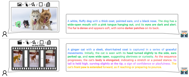 描述性任意模型(Describe Anything Model,简称DAM)能够为图像(上图)和视频(下图)中用户指定的区域生成详细的本地化描述。DAM接受多种区域指定方式,包括点击、涂鸦、框选和掩膜。对于视频而言,只要在任意一帧中指定区域即可。