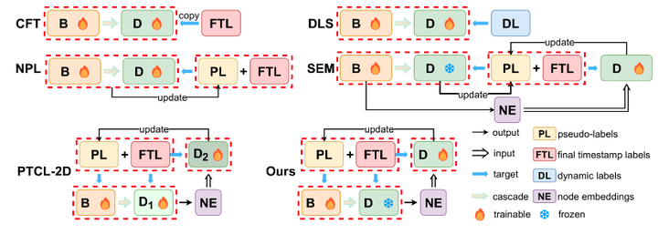 PTCL的方法的概述:利用动态图骨干网络和解码器,进行链接预测和时间戳标签的细化。预热阶段的链接预测任务为后续的伪标签细化提供了基础,而时间课程学习策略则确保了伪标签的质量。