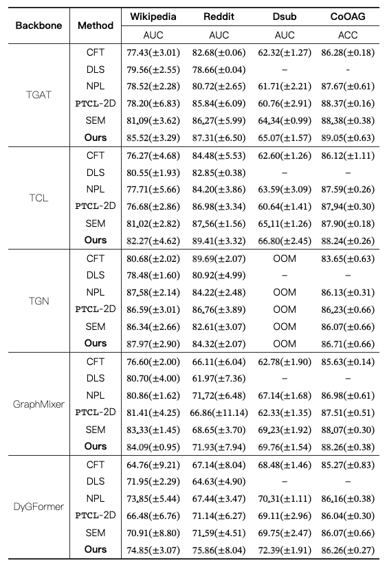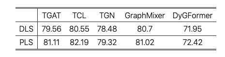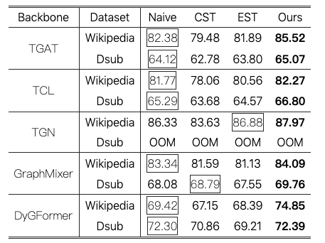 在 Wikipedia、Reddit、Dsub、CoOAG 数据集上的性能比较。我们使用五个随机种子运行所有实验以确保一致的评估,并报告平均性能以及括号中的标准差。粗体表示最佳性能,下划线表示次佳。由于缺乏动态标签,Dsub 和 CoOAG 数据集无法应用 DLS 方法。TGN 由于其高空间成本,在 Dsub 上运行耗尽内存。