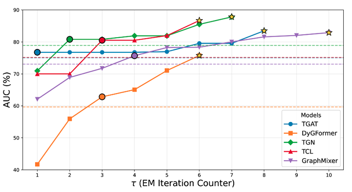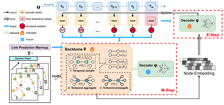 在预热阶段,动态图主干在链接预测任务上进行训练,其中动态图结构作为目标。预热后,在每个 M 步中,主干接收最终时间戳标签、伪标签和动态图结构作为输入,而解码器在 E 步中训练以细化伪标签。此外,时间课程学习策略根据伪标签与最终时间戳标签的时间接近程度优先考虑伪标签,以确保更高的训练质量。