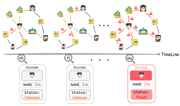 一个金融系统的展示。该图表示一个动态金融系统,其中节点代表实体,如用户、支付卡和金融机构,而边代表交易关系。随着时间的推移,通过一系列交易跟踪用户行为,一些用户的标签(账户状态)最终可能被识别为欺诈。