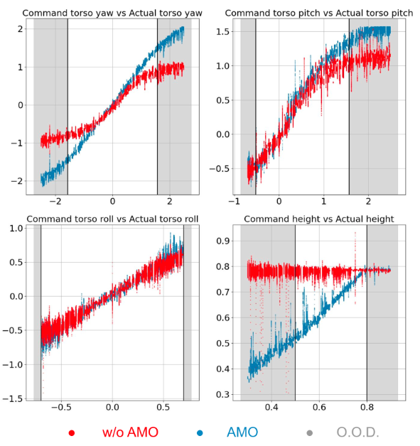 评估分布内(I.D.)和分布外(O.O.D.)跟踪结果。每个图都显示了目标方向与实际指令方向的比较。白色区域表示 I.D.,即指令在轨迹优化和 RL 训练中都使用。灰色区域表示 O.O.D.,即指令在轨迹优化或 RL 训练中都不使用。红色和蓝色曲线分别代表无 AMO 和 AMO 的情况。