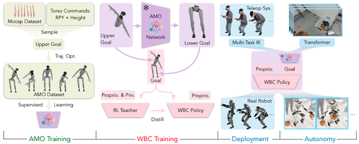 AMO 数据集用于训练一个网络,该网络能够将躯干命令转换为参考下肢姿态。结合 AMO 模块的输出,可以训练强化学习策略,实现全身控制。
