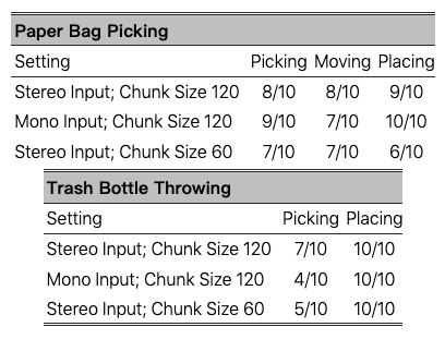 表 IV:每个任务的各个阶段的训练设置和成功率。每个训练设置包括:使用立体(左右眼图像)或单目(单张图像)视觉输入;在动作块分割转换器中使用的块大小。