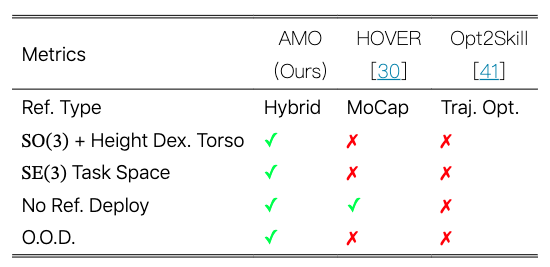 与两种近期代表性的人形运动模仿工作的比较。灵活度躯干表示机器人能否调整其躯干的朝向和高度以扩大工作空间。任务空间表示末端执行器。无参考部署表示机器人在部署过程中是否需要参考运动。O.O.D.表示工作是否评估了 O.O.D.性能,这是机器人由人类操作员控制且控制信号高度不可预测的典型情况。