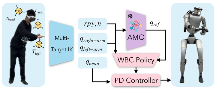 遥操作系统概述。操作员提供三个末端执行器目标:头部、左腕和右腕姿态。多目标逆运动学计算通过同时匹配三个加权目标来得出上层目标和中间目标。中间目标( 𝐫𝐩𝐲,ℎ )被输入到 AMO 并转换为下层目标。