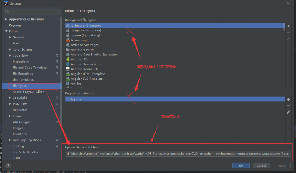 2. 找到Ignore files and folders,添加自己需要过滤的内容(忽略文件和目录)