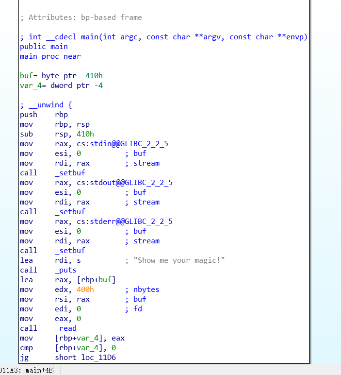 call了read 大小是400,而栈的大小是410 用汇编直接写的 没别的东西 直接 shell注入即可