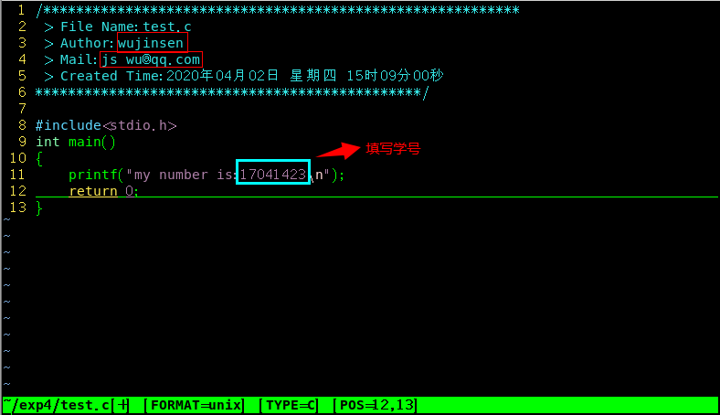 可以通过vim编辑器编写一个最简单的C语言程序,如写一个输出自己学号的程序。先创建一个文件夹,然后进入该新创建的文件夹。