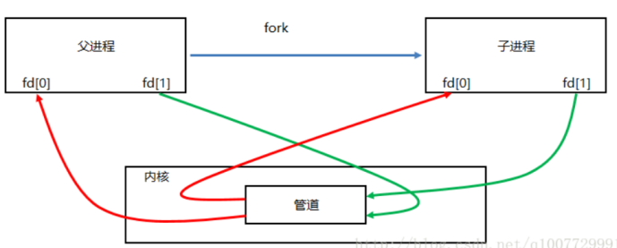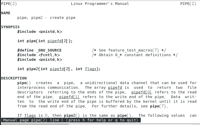 pipe 函数打开的文件描述符是通过参数(数组)传递出来的,而返回值表示打开成功(0)或失败 (-1)。 它的参数是一个大小为 2 的数组。此数组的第 0 个元素用来接收以读的方式打开的描述符,而第 1 个元 素用来接收以写的方式打开的描述符。也就是说, pipefd[0] 是用于读的,而 pipefd[1] 是用于写 的。