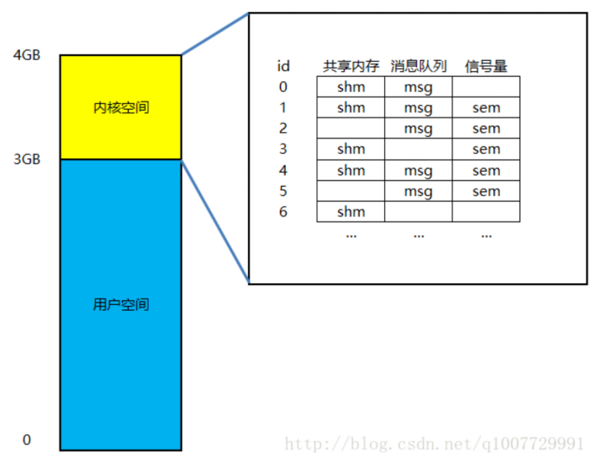 进程空间的高 1G 空间( 3GB-4GB )是内核空间,该空间中保存了所有的 IPC 内核对象。