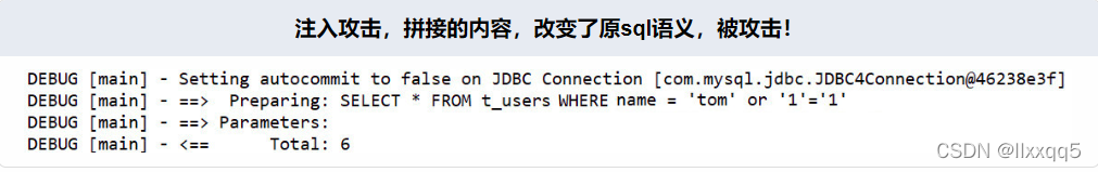 WHERE name = '${name}' <!-- 会存在注入攻击 比如传入参数是 【String name = "tom' or '1'='1";】-->
