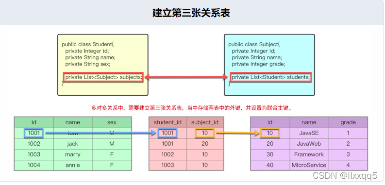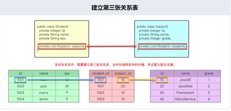 双方均可建立关系属性,建立关系属性后,对应的Mapper文件中需使用< ResultMap >完成多表映射。