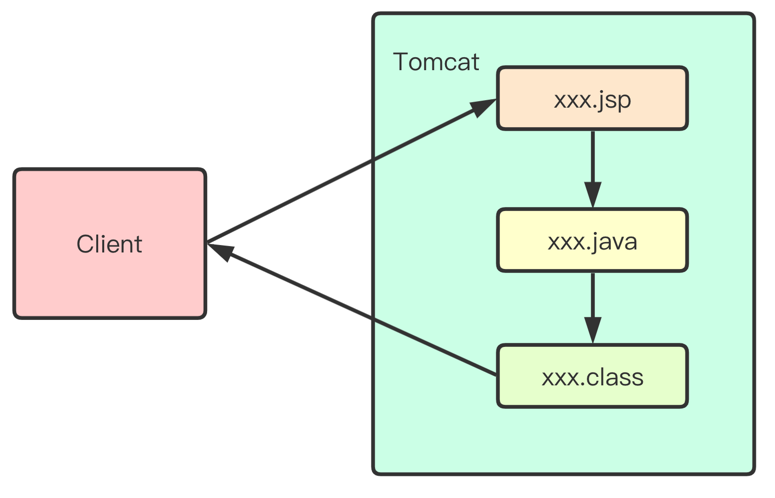 Tomcat会将xxx.jsp转换成Java代码,进而编译成.class文件运行,最终将运行结果通过response响应给客户端。