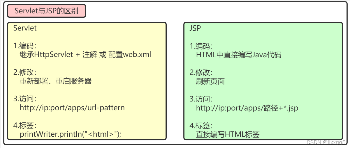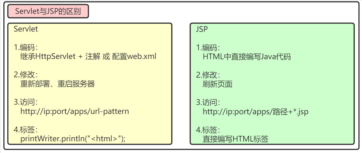 与 Servlet 相比:JSP可以很方便的编写或者修改HTML网页而不用去面对大量的println语句。