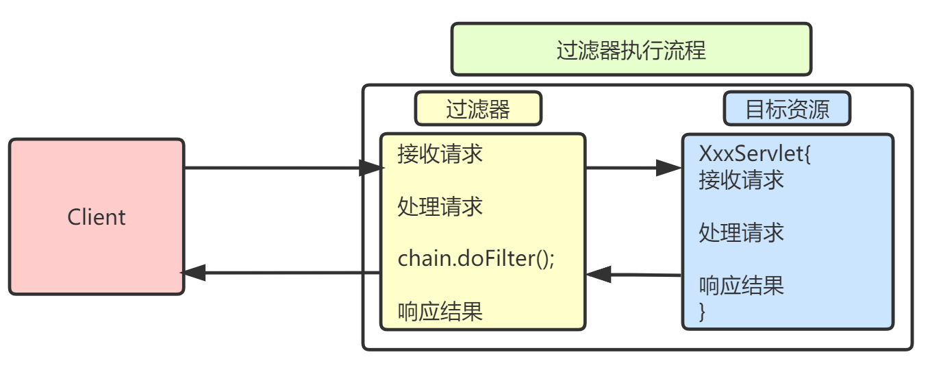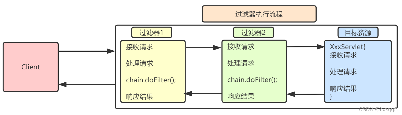 执行地位在Servlet之前,客户端发送请求时,会先经过Filter,再到达目标Servlet中;响应时,会根据执行流程再次反向执行Filter