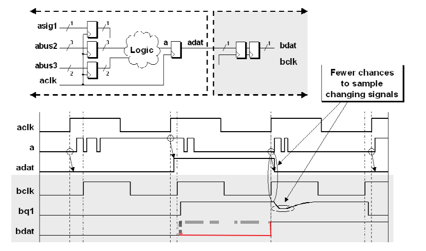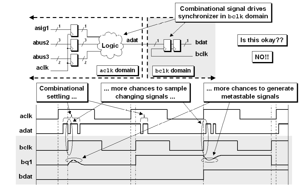 2.从clk_slow同步到clk_fast,从clk_slow打出的信号必须经过clk_slow打过,否则组合逻辑输出会有毛刺,被clk_fast采到,会增大clk_fast时钟域第一级触发器出现亚稳态的概率,从而增大同步器出现亚稳态的概率;如下图所示: