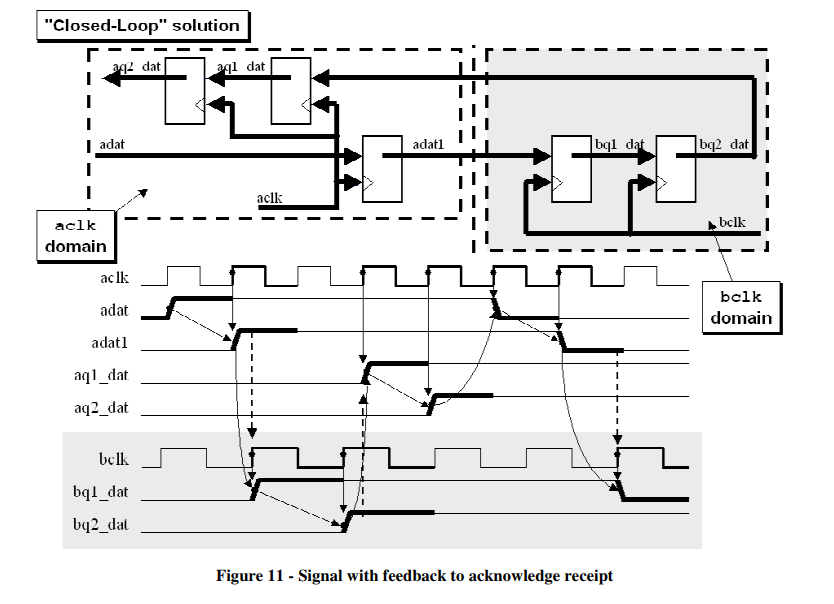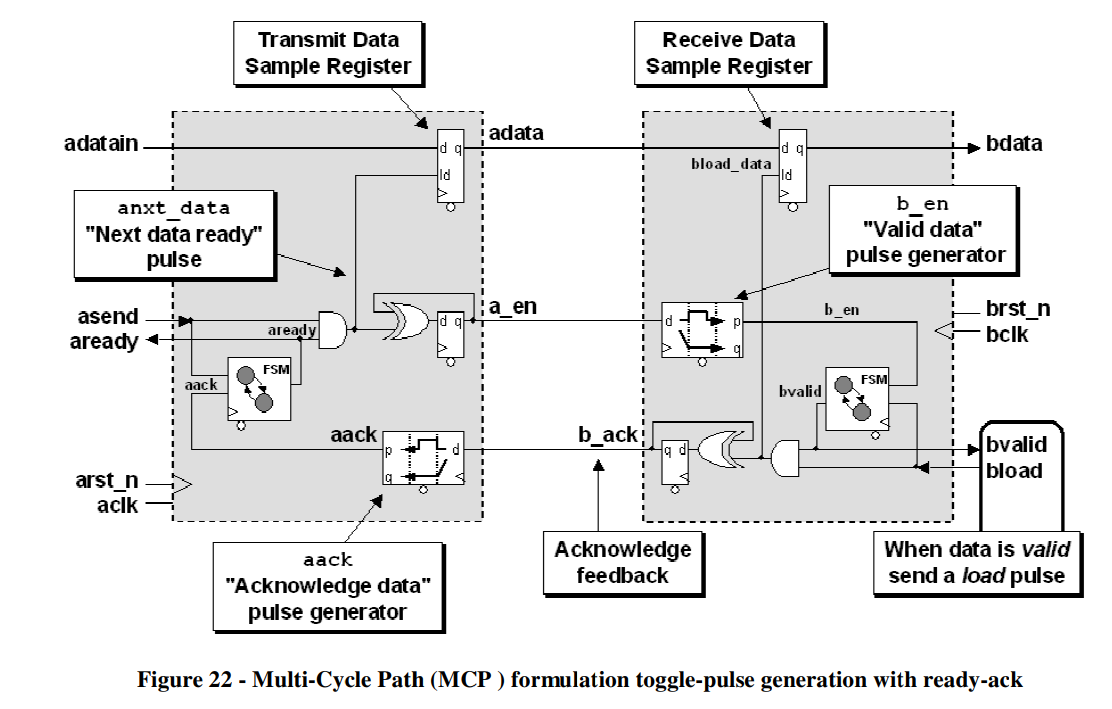 为了接收端不用始终做好接收数据的准备,可以在接收端也做一个握手机制,bvalid代表Receive Data Sample Register的D端数据是valid,此valid信号通知接收端可以接收数据,然后接收端发出bload,来告诉接收时钟域可以把adata load到bdata。