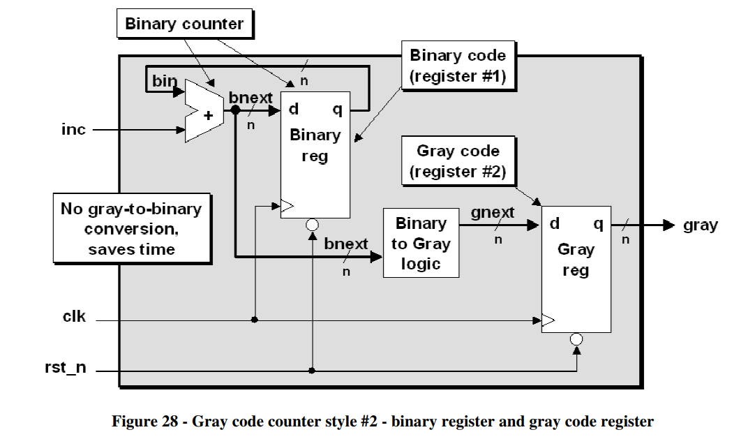 格雷码计数器适合同步二进制计数器,有2种产生格雷码计数器的方式: