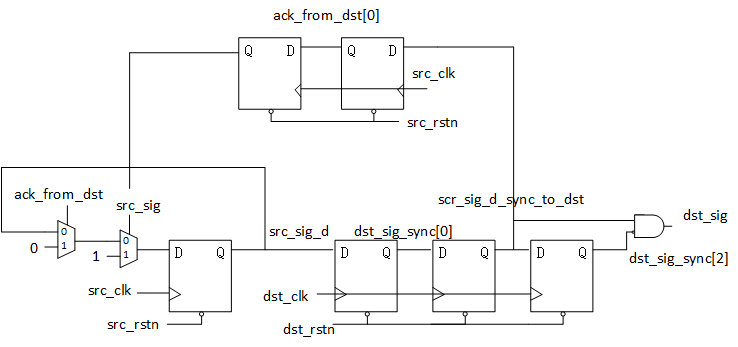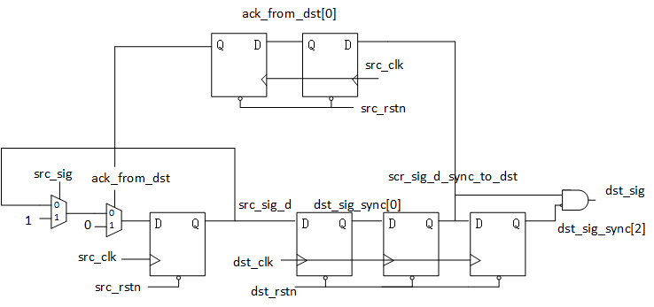 这种脉冲同步器可以接受单周期脉冲,也可以接受多周期脉冲,设计理念是如果Input没有拉低,那么就不会让ack_from_dst拉低src_sig_d;